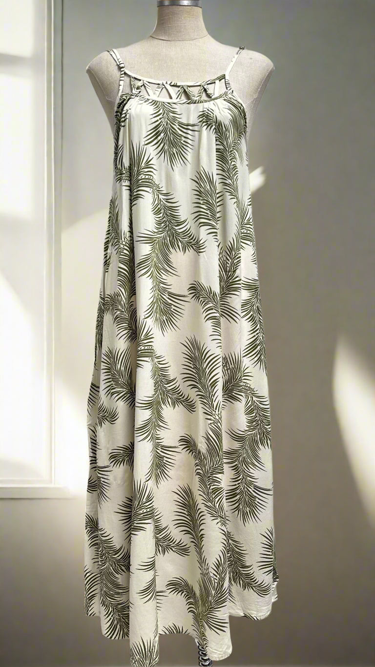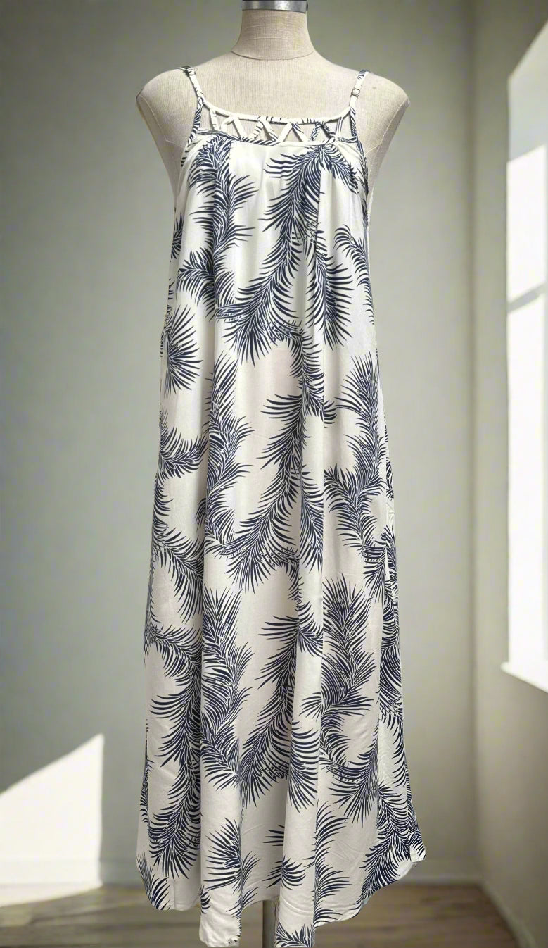 The Leilani Dress in Palm Leaves, by Angels by the Sea Hawaii, captures the brand's mission of encapsulating the beauty of Hawaii in its designs. This women's dress is a piece of casual elegance, suitable for both beach outings and upscale evening events. The brand's offerings often feature unique details that set them apart. This dress ensures you feel beautiful, confident, and comfortable. A true embodiment of the aloha spirit!