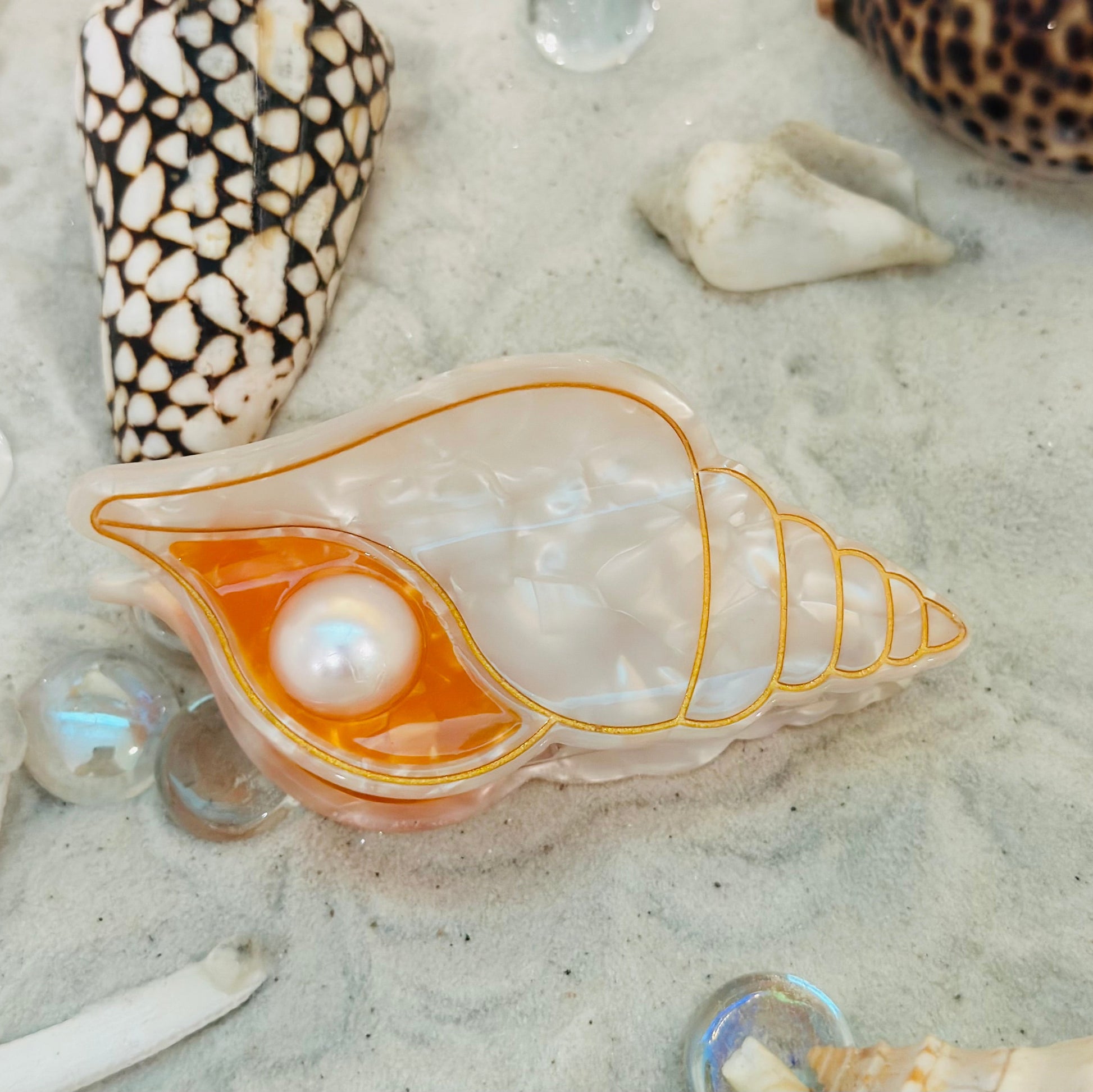 This seashell hair clip captures the spirit of the islands with its pearly iridescence and golden-lined spiral design. A luminous faux pearl rests inside a warm splash of orange, echoing the glow of a Hawaiian sunset over the ocean. Whether you’re strolling the beach at Waikīkī, dancing at a lūʻau, or just wanting to bring a touch of aloha to your day, this clip is a little piece of island magic for your hair.