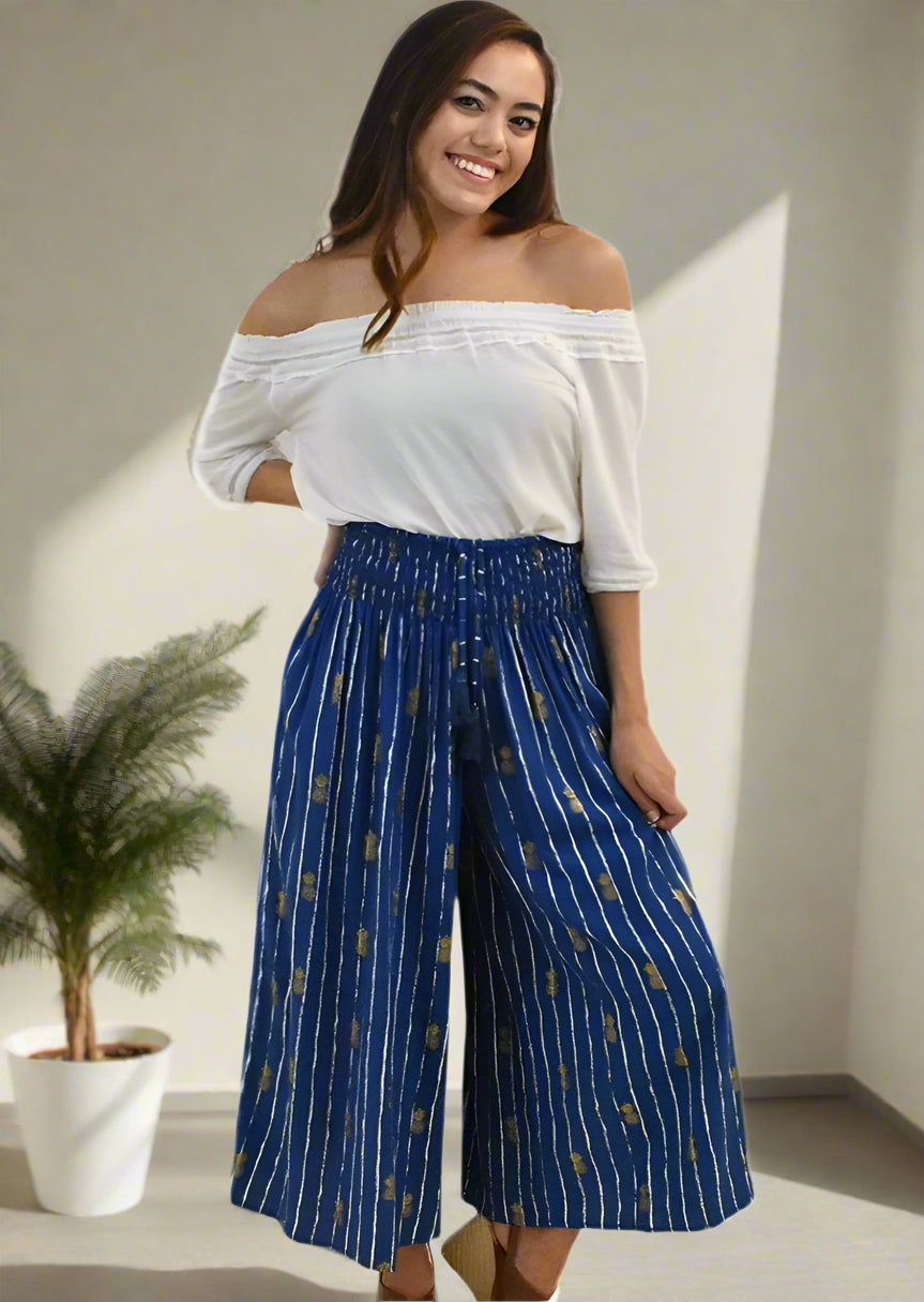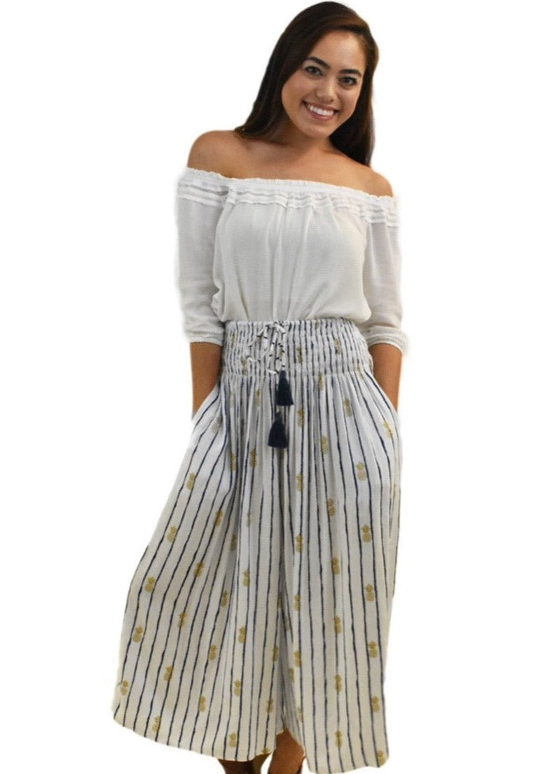 These Pineapple Print Wide Hawaiian Pants are a unique design that looks like a skirt but is actually a very comfortable pair of pants. The Pineapple Print Wide Hawaiian Pants feature an elastic waist and tie with cute hand-stitched tassels. These pants are featured in our signature Golden Pineapple print.